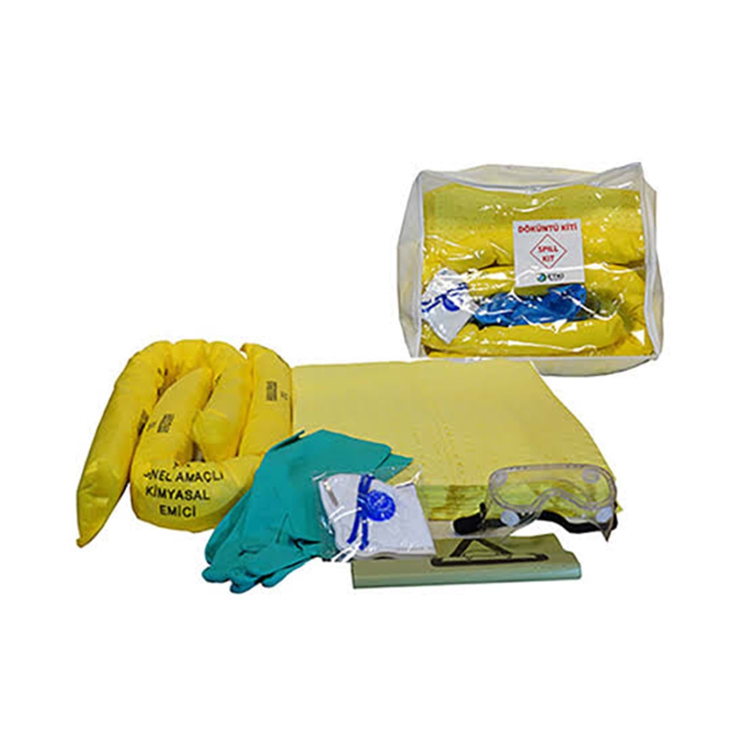 Kit Çanta İçeriği 15 Adet Emici Ped (40 x 50 cm) 2 Adet Emici Sosis (8 x 120 cm) 1 Set KKD Ekipmanları; Nitril Eldiven, Gözlük, Atık Torbası