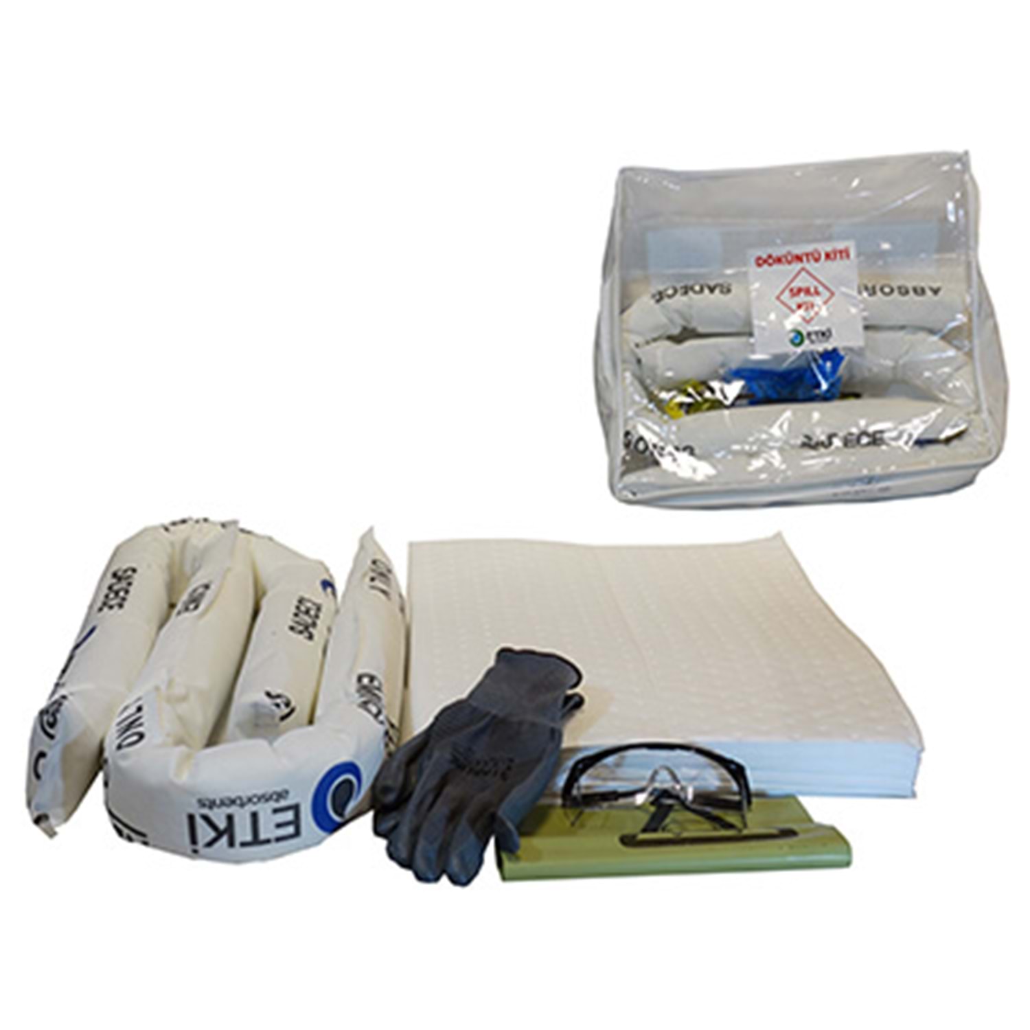 15 Adet Emici Ped (40 x 50 cm) 2 Adet Emici Sosis (8 x 120 cm) 1 Set KKD Ekipmanları; Nitril Eldiven, Gözlük, Atık Torbası